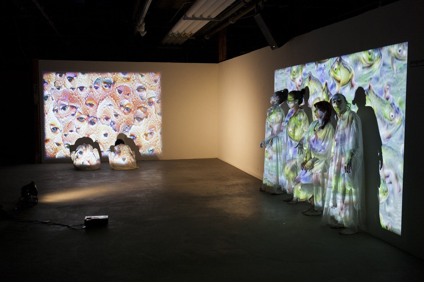 The artists first experimented with wall projections, but the white attire and makeup of Butoh suggested an opportunity to project directly onto the dancers bodies. To obtain a stable projected image, the artists rigged a projector with a Kinect sensor and a steady cam. After conducting several experiments, Okumura and Tyka chose flora and fauna themes as the entry point for artistic dialogue - reminiscent perhaps of ancient evolutionary remnants in our human selves.