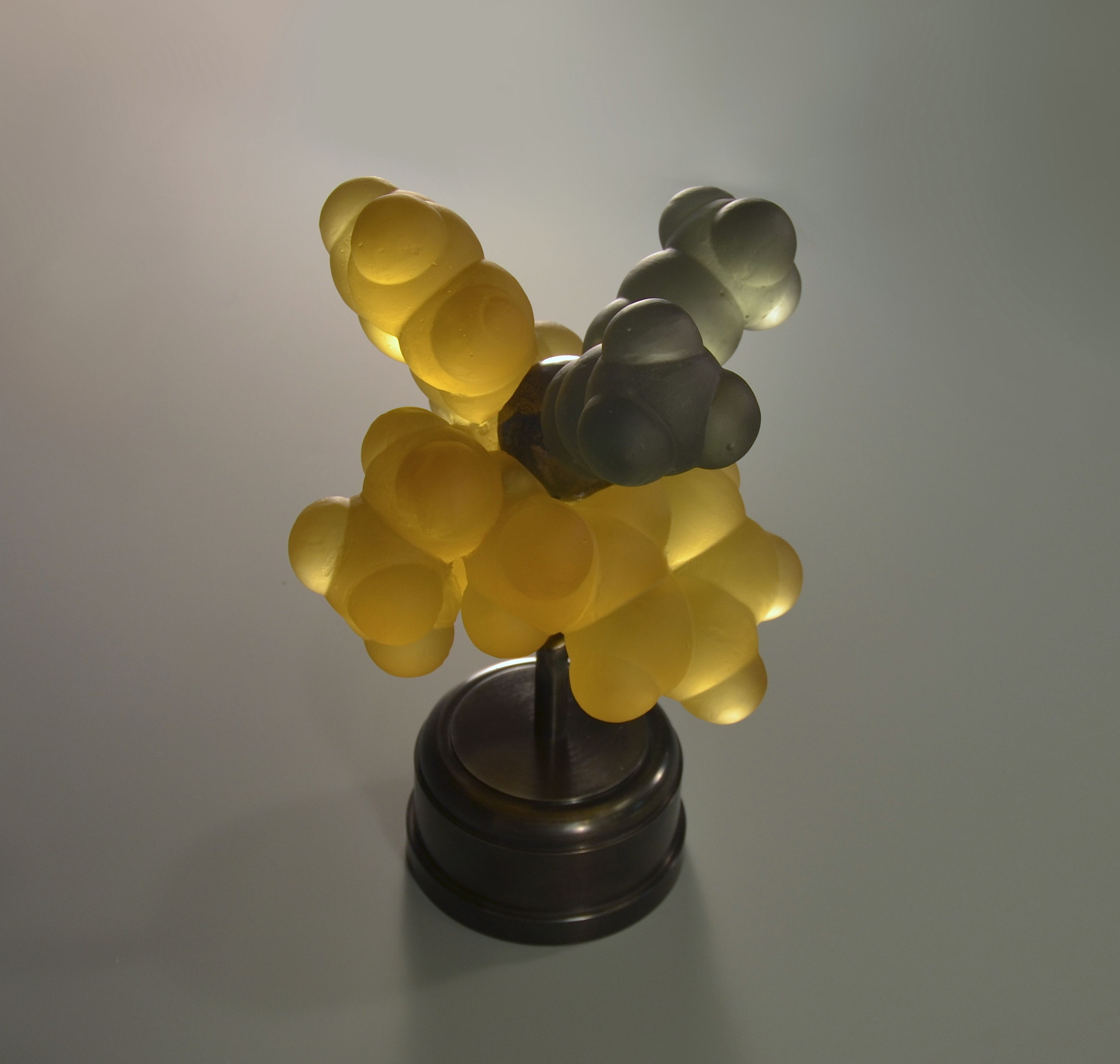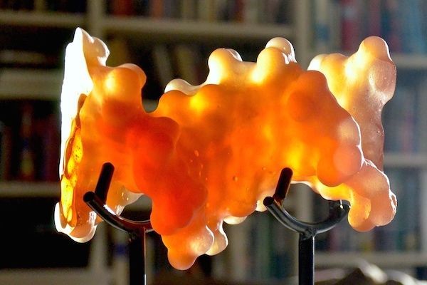 Tears display antibacterial activity, a property that was discovered by Alexander Fleming around the turn of the last century. The active agent, Lysozyme, is also found in saliva, nasal mucus and even breast milk and constitutes a major element in the body's innate immune defense. Lysozyme was also one of the first proteins and the very first enzyme to have its three dimensional structure elucidated in the 60s through painstaking X-ray crystallography work by David Phillips. The coordinates obtained were used here to create the initial 3D model of the protein which was then 3D printed in plastic, post processed and then recast in clear lead glass using direct lost-PLA casting. Many bacteria implicated in human disease have a protective cell wall. Lysozyme is an enzyme which digests these carbohydrate barriers, thereby significantly weakening the potential intruders. The carbohydrate, part of which is cast here in bronze, fits tightly into the active site cleft of the Lysozyme enzyme. Deep inside that cleft the cleavage reaction takes place, catalysed by the protein. After cleavage Lysozyme releases both parts and moves on to a new cleavage site, gradually breaking down the cell wall. Discovery of the atom structure led to the first detailed enzymatic mechanism to be described and was a major breakthrough in our understanding of how our bodies' metabolic functions.