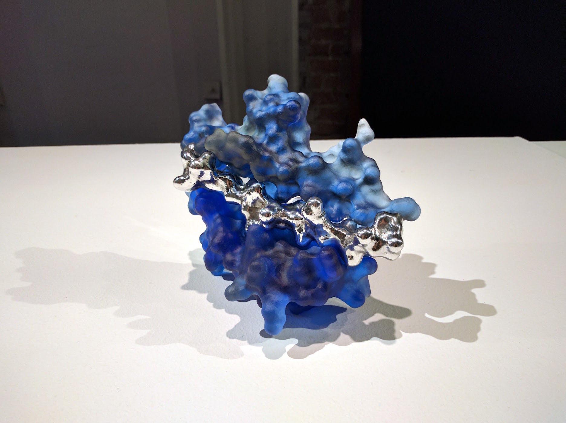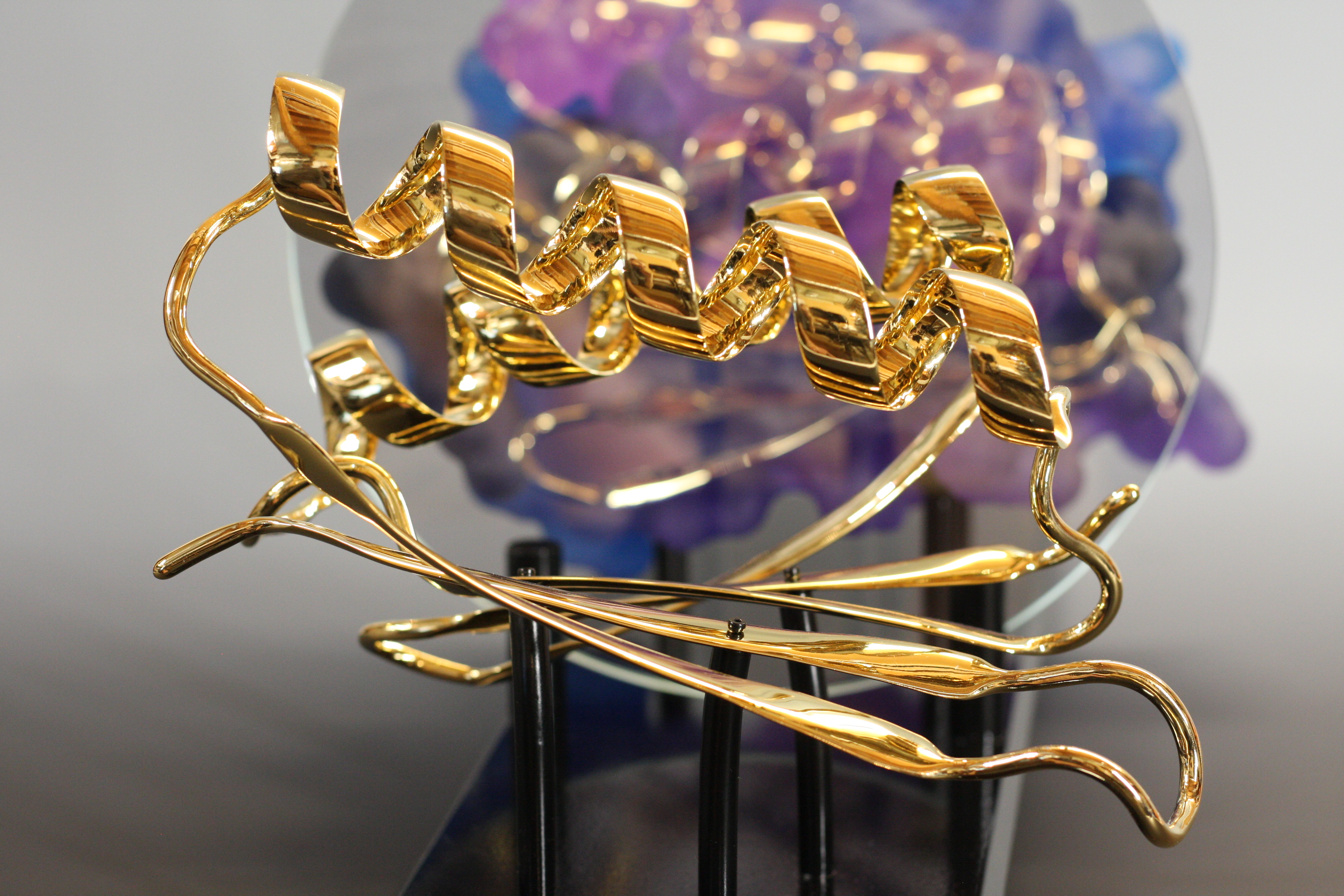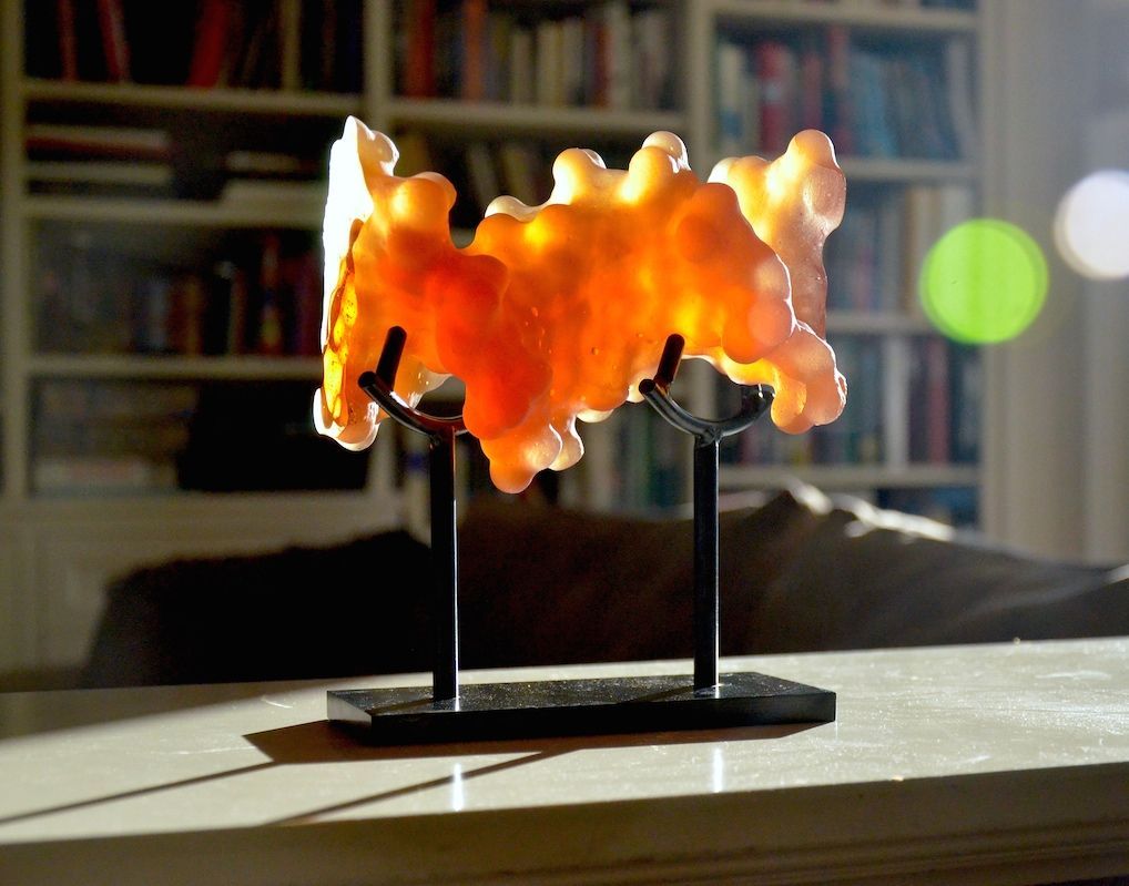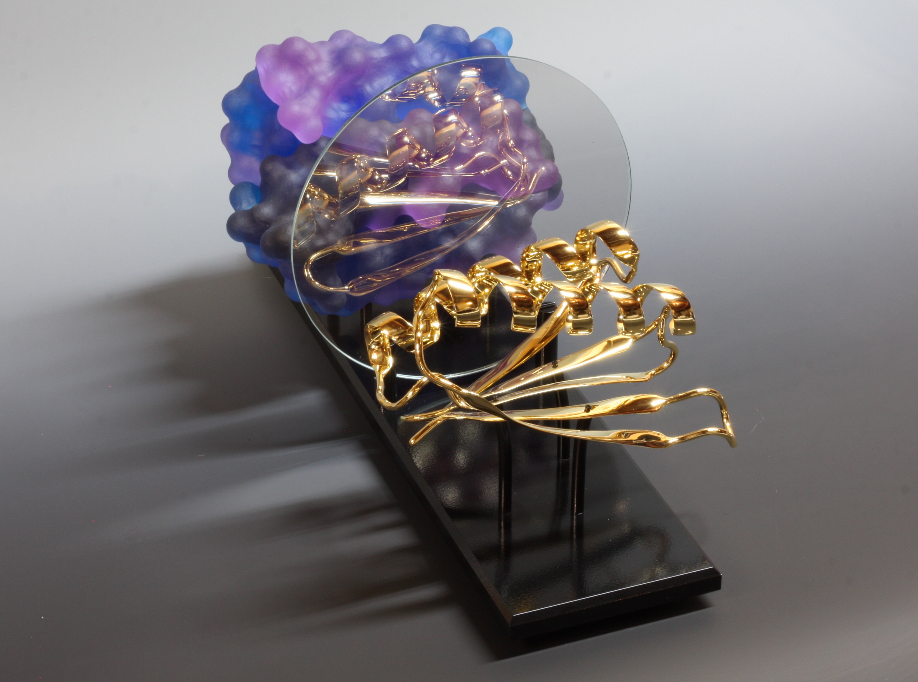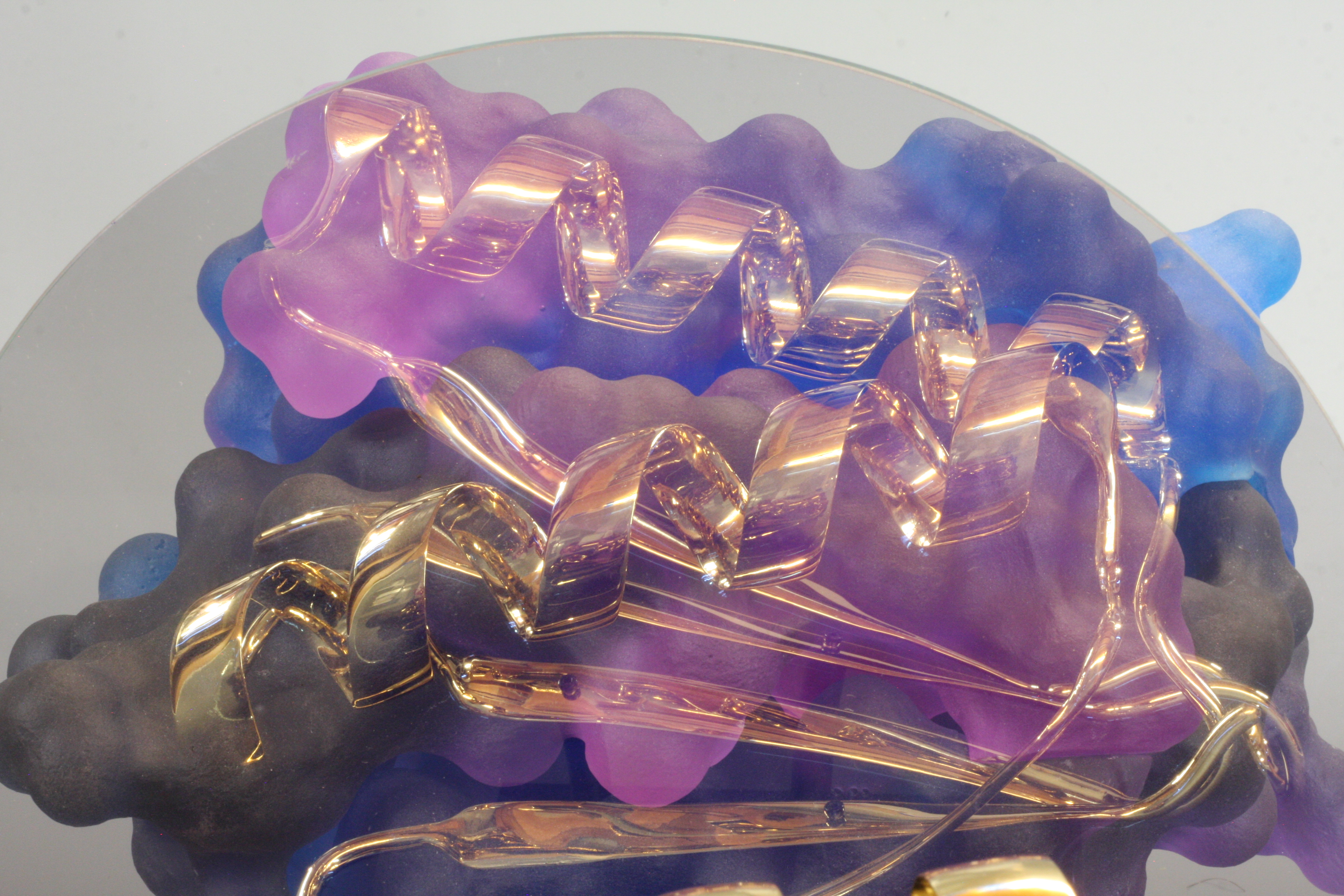 Top7 was the first denovo-designed protein with a fold not seen in nature. This piece was created as a commission for the Institute for Protein Design (IPD) on their 10th anniversary as a special gift to David Baker (my former PostDoc advisor). This sculpture comprises two representation of the protein Top7: one as a solvent accessible surface and one as a ribbon diagram. The half mirror allows the viewer to appreciate both representations superimposed one one another.