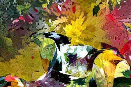 This piece is the result of two concepts an artificial neural network has learned about expressed simultaneously: Pitchers and Flowers. Together the form a blended new whole, though the combination has occured not in the space of pixels but in the semantic or latent space that is created beed inside the neural network.