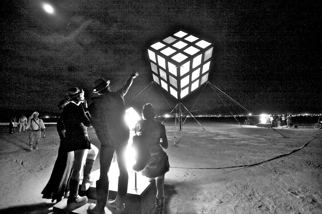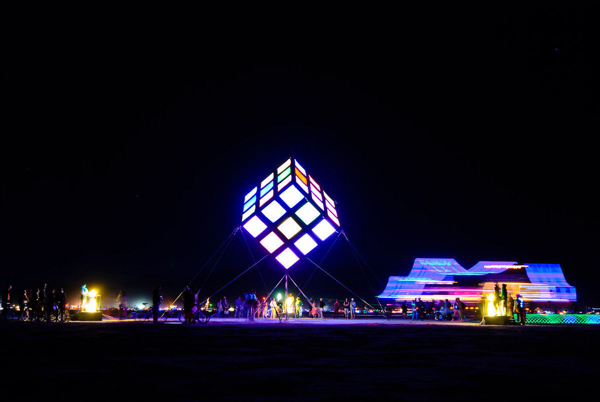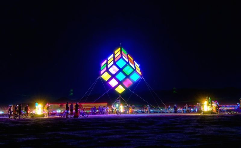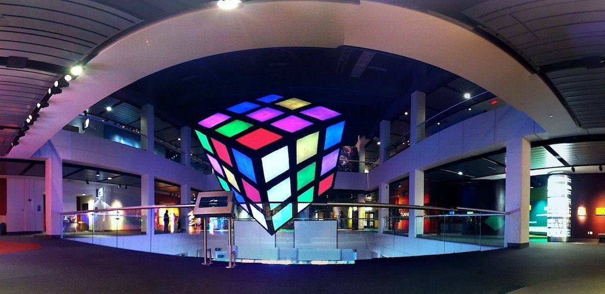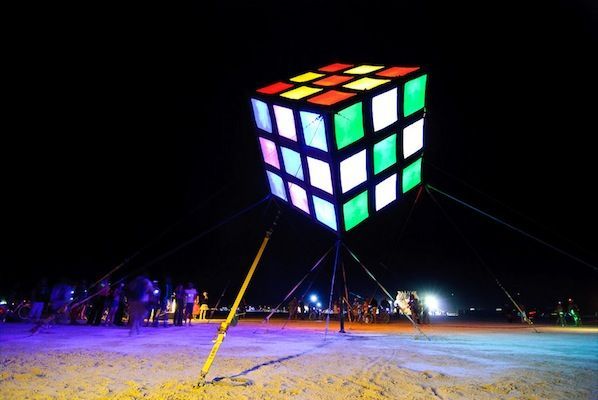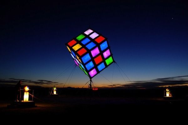 Groovik’s Cube is a fully playable, 35ft-high sculpture inspired by the classic puzzle, Rubik’s Cube. It was built by Mike Tyka, Barry Brumitt and a team of artists and engineers from Seattle in 2009. It is, to our knowledge, the largest functional Rubik’s Cube structure in the world. Groovik’s Cube is controlled from 3 control stations that surround the main structure - each player is able to rotate only one axis, creating an entirely new, collaborative puzzle solving experience. Groovik’s Cube offers a unique new playing mode where three players must collaborate to solve the classic Rubik’s cube puzzle. The cube is controlled via three touch screen interfaces located around the cube, with each interface capable of rotating only one axis of the cube - no single player can solve the cube alone. This innovative twist adds a completely new dimension to the game and turns the classic puzzle into a social game and a fascinating social spectacle. Groovik’s Cube is built from a lightweight aluminum frame, covered in fabric, and illuminated from the inside by 2 kilowatts of high-power LEDs. It simulates the motion of an ordinary Rubik’s Cube by animating the rotations on the 54 "pixels" that comprise the cube. The total weight of the structure is around 2000 lbs and is designed such that participants may walk safely under the structure. The thin supports are virtually invisible from a distance, creating the magical illusion of a floating cube.