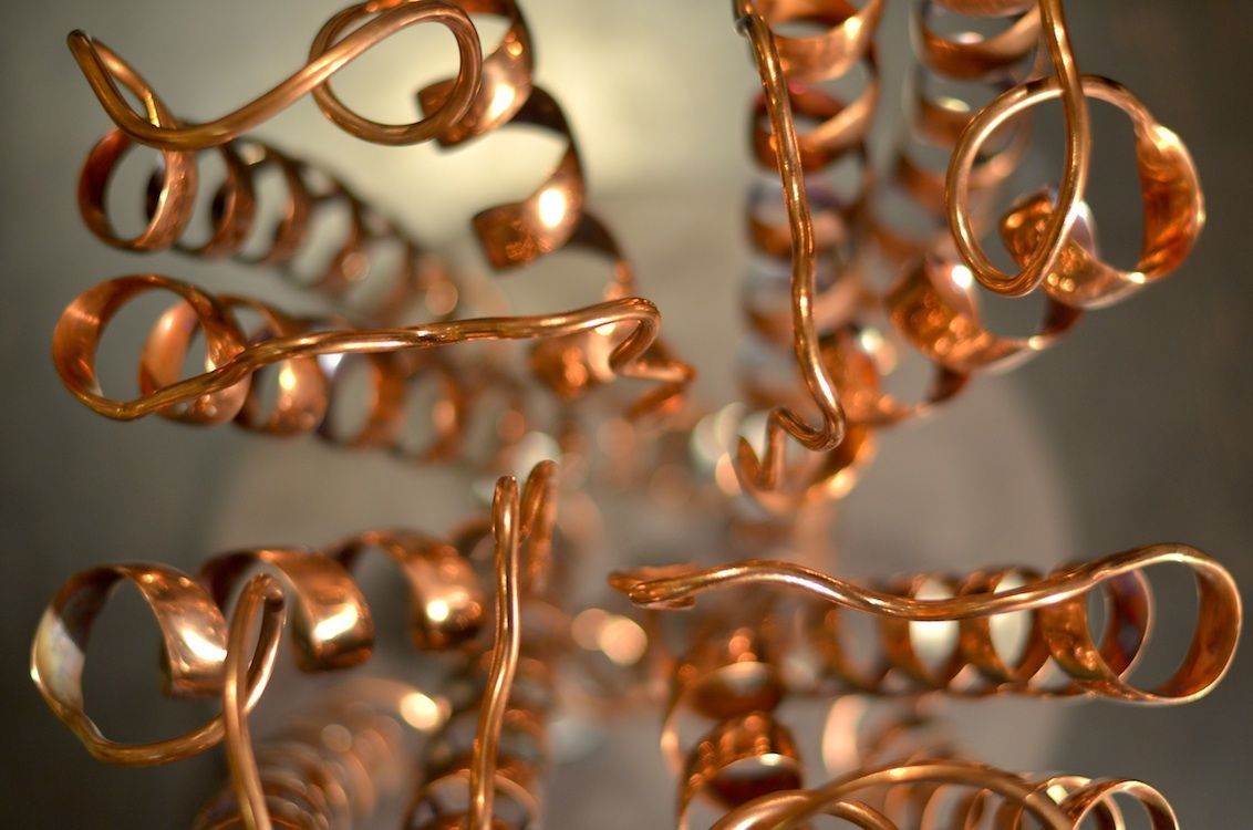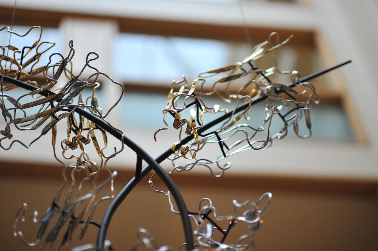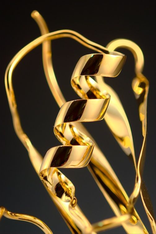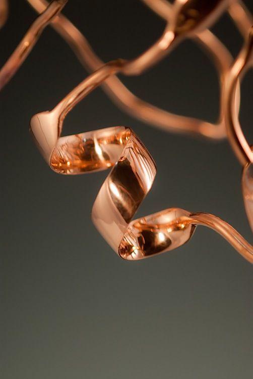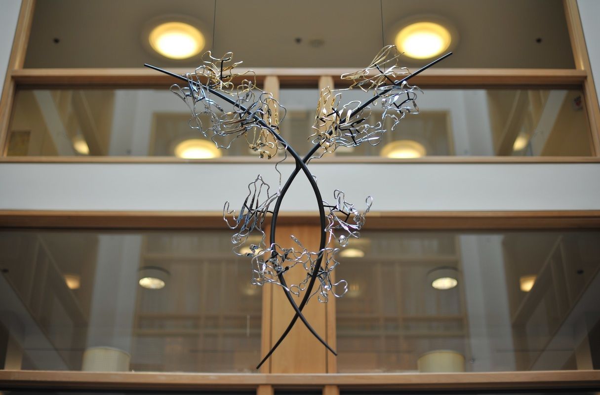 Life is a dynamic equilibrium of creation and destruction. Inside our cells the protein nano-machines, to which we owe our distinction from the inorganic, are perpetually recycled and rebuilt, forever battling the inevitable fate of entropic decay. Once covalently tagged with Ubiquitin, a protein is doomed to destruction by the proteasome, a protein degradation machine found in all of our cells. The component amino acids are then reused to synthesize new proteins. The constant recycling and rebuilding of proteins not only ensures that damaged proteins are removed quickly, but also allows rapid regulation of enzyme levels in the cell. The meandering path of the metal ribbon closely follows the fold and thus the internal structure of Ubiquitin. It features all of the major structural elements of typical proteins, including two alpha helices and a curved beta sheet. Its small size (76 amino acids) makes it one of the most studied proteins for protein folding and dynamics.
