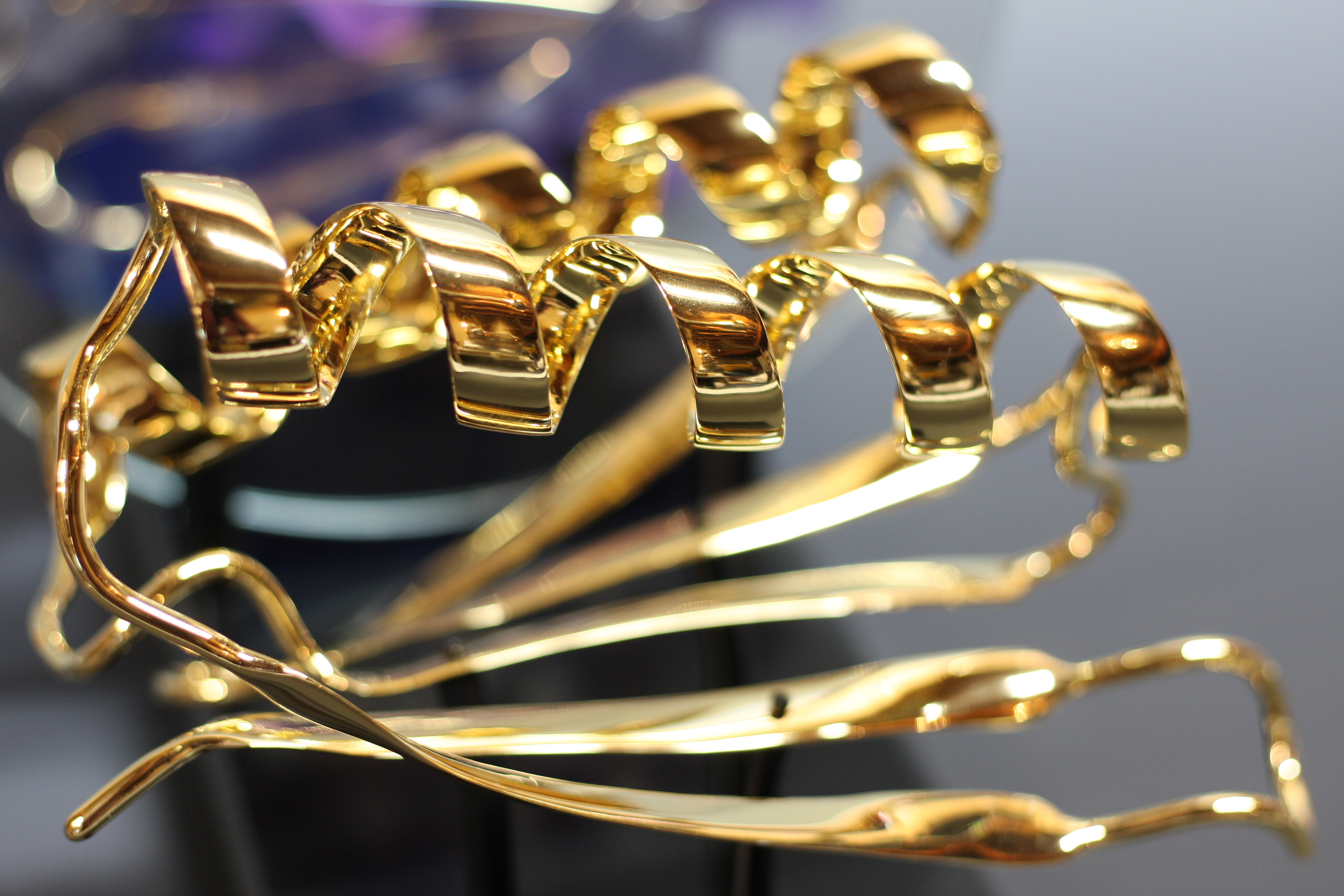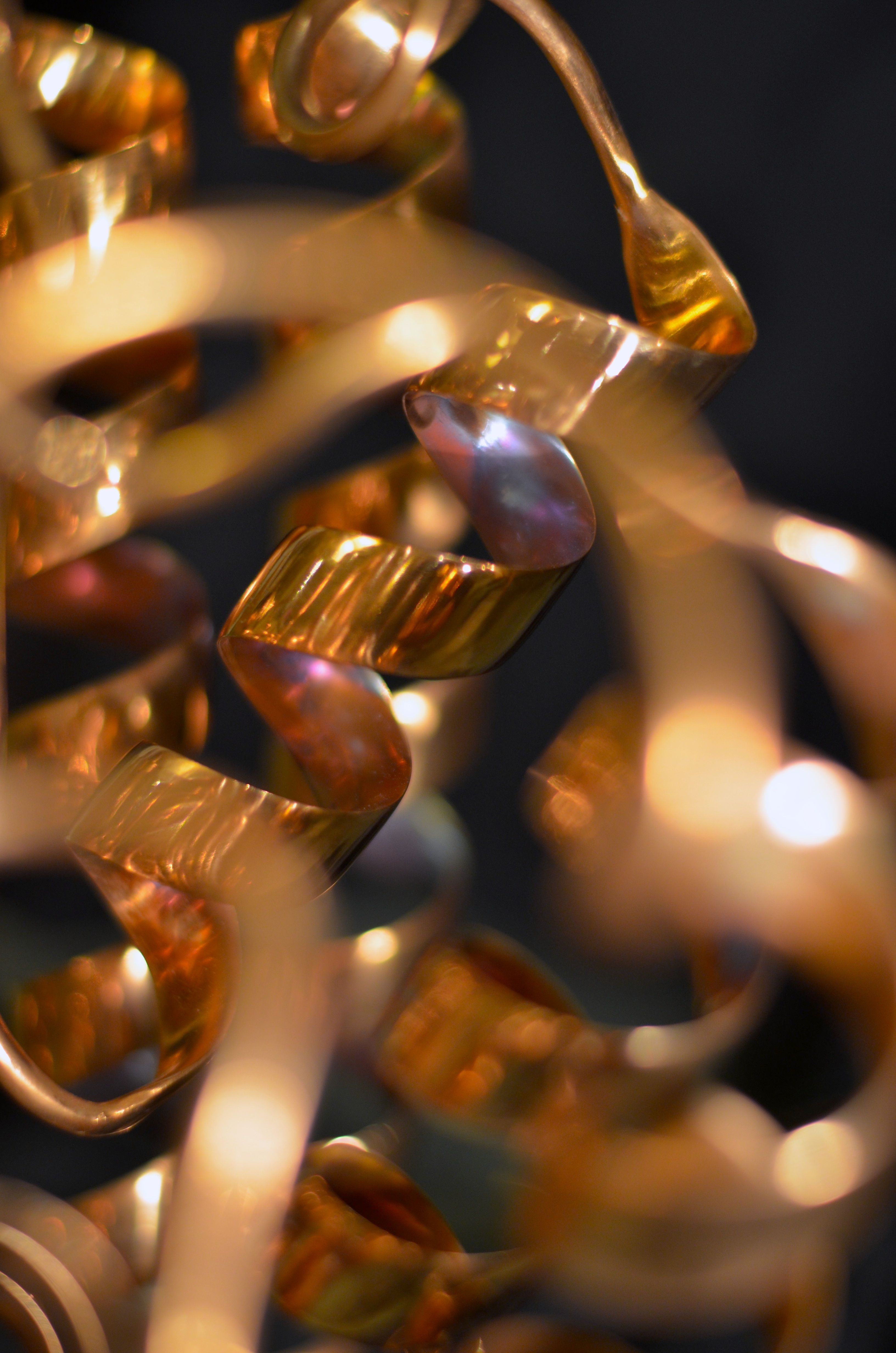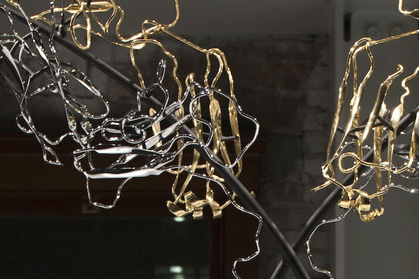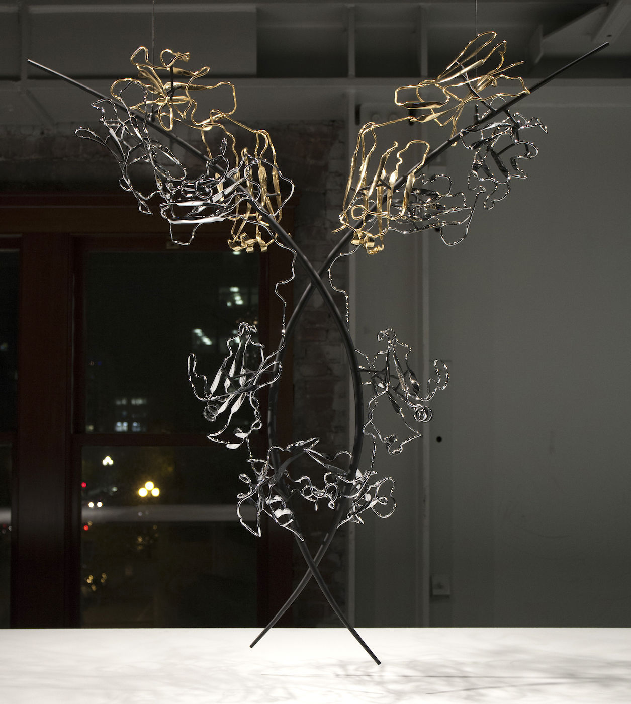 Life is a dynamic equilibrium of creation and destruction. Inside our cells the protein nano-machines, to which we owe our distinction from the inorganic, are perpetually recycled and rebuilt, forever battling the inevitable fate of entropic decay. Once covalently tagged with Ubiquitin, a protein is doomed to destruction by the proteasome, a protein degradation machine found in all of our cells. The component amino acids are then reused to synthesize new proteins. The constant recycling and rebuilding of proteins not only ensures that damaged proteins are removed quickly, but also allows rapid regulation of enzyme levels in the cell. The meandering path of the metal ribbon closely follows the fold and thus the internal structure of Ubiquitin. It features all of the major structural elements of typical proteins, including two alpha helices and a curved beta sheet. Its small size (76 amino acids) makes it one of the most studied proteins for protein folding and dynamics.