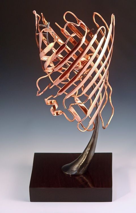The boundary of cellular life, which delineates the living chemistry from its surroundings, was among the most important fundamental inventions of evolution eons ago. Protein channels span these molecular castle walls and regulate the diffusional traffic of molecules trying to enter or leave the cell. One class of these molecular gatekeepers are the Porins, beta-barrel proteins that are situated in the outer membranes of cells or organelles such as human mitochondria. The Porin channel is partially blocked by a loop, called the eyelet, which projects into the cavity and defines the size of solute that can traverse the channel. Porins can be chemically selective, they can transport only one group of molecules, or may be specific to one molecule. For example, for antibiotics to be effective against a bacterium, it must often pass through an outer membrane Porin. Bacteria can develop resistance to the antibiotic by mutating the gene that encodes the Porin , the antibiotic is then excluded from passing through the outer membrane. The scale used in this sculpture is 2.5 inch/nm (a magnification factor of 63 million). At this magnification a grain of rice would roughly span the distance between Seattle and Portland.