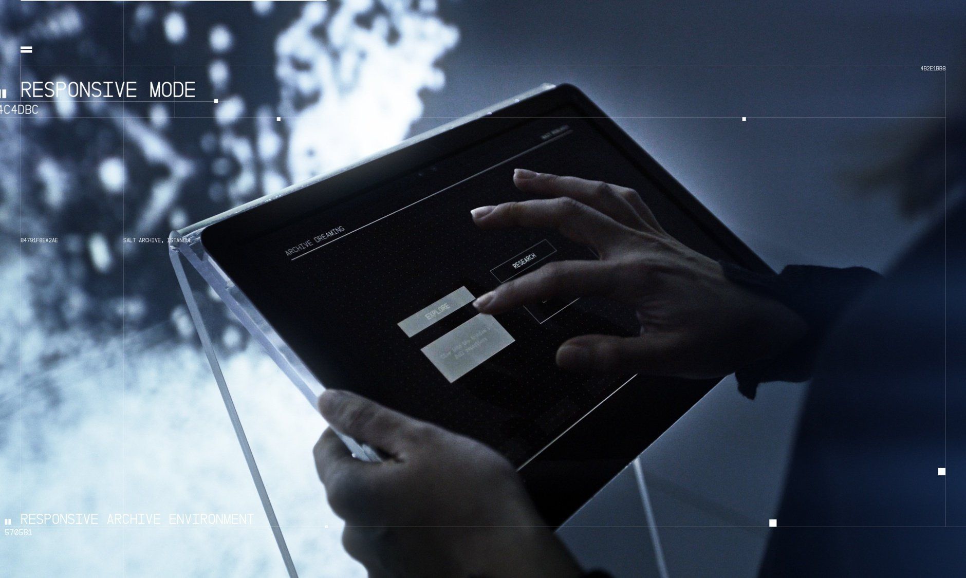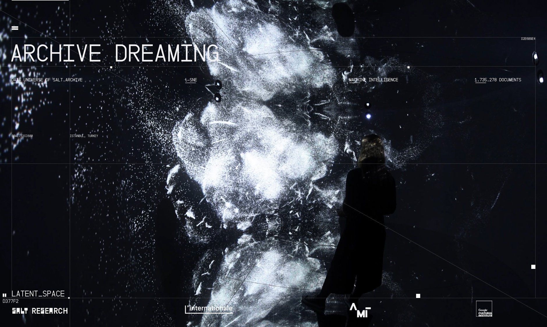 Archive Dreaming is a collaboration with Refik Anadol, who was commissioned to work with SALT Research collections an archive of 1,700,000 historical documents. Shortly after receiving the commission, Anadol was a resident artist for Google's Artists and Machine Intelligence Program where he closely collaborated with Mike Tyka and explored cutting-edge developments in the field of machine intelligence in an environment that brings together artists and engineers. Developed during this residency, his intervention Archive Dreaming transforms the gallery space on floor -1 at SALT Galata into an all-encompassing environment that intertwines history with the contemporary, and challenges immutable concepts of the archive, while destabilizing archive-related questions with machine learning algorithms.
