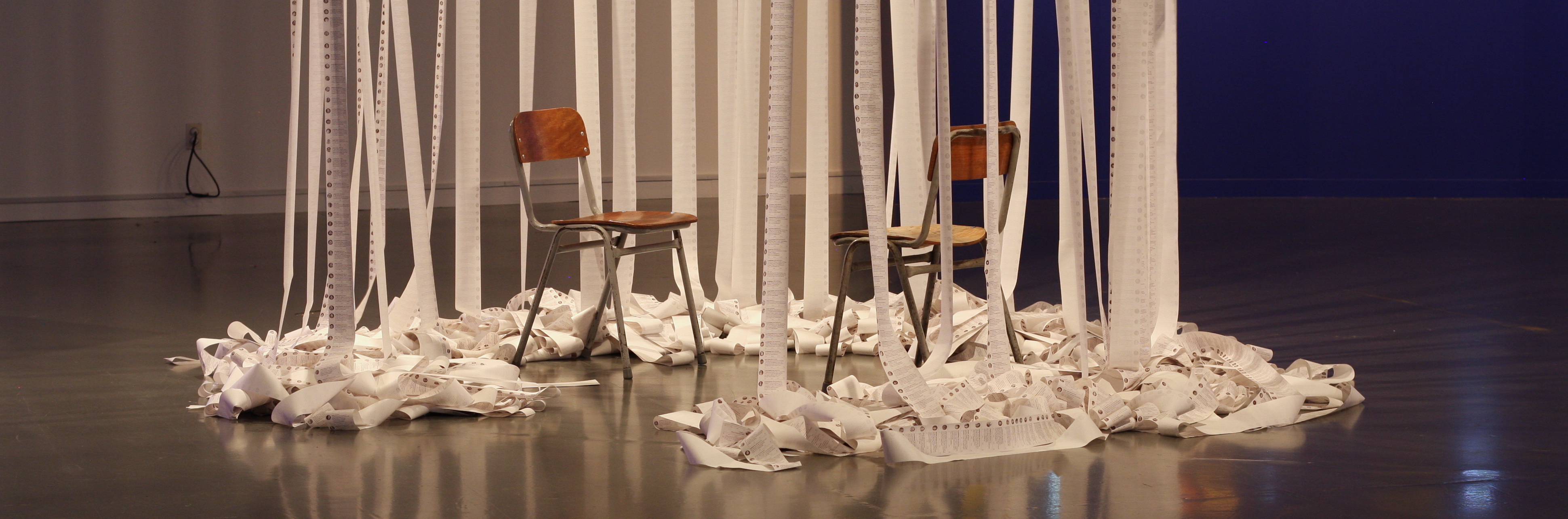 The 20 thermal receipt printers are live and continuously printing AI generated tweets at a slow but steady pace, letting this sculpture evolve and change every day. Ultimately the torrent overwhelm and bury the central space and chairs.