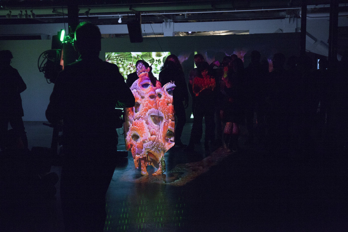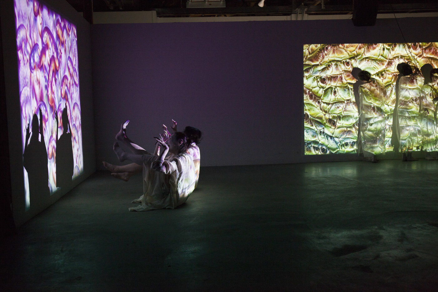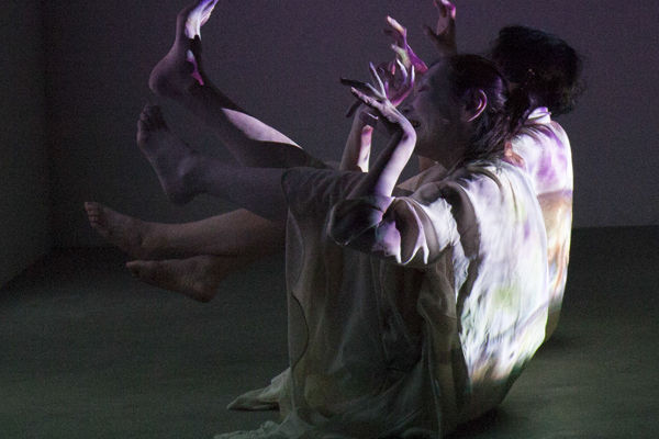 The artists first experimented with wall projections, but the white attire and makeup of Butoh suggested an opportunity to project directly onto the dancers bodies. To obtain a stable projected image, the artists rigged a projector with a Kinect sensor and a steady cam. After conducting several experiments, Okumura and Tyka chose flora and fauna themes as the entry point for artistic dialogue - reminiscent perhaps of ancient evolutionary remnants in our human selves.