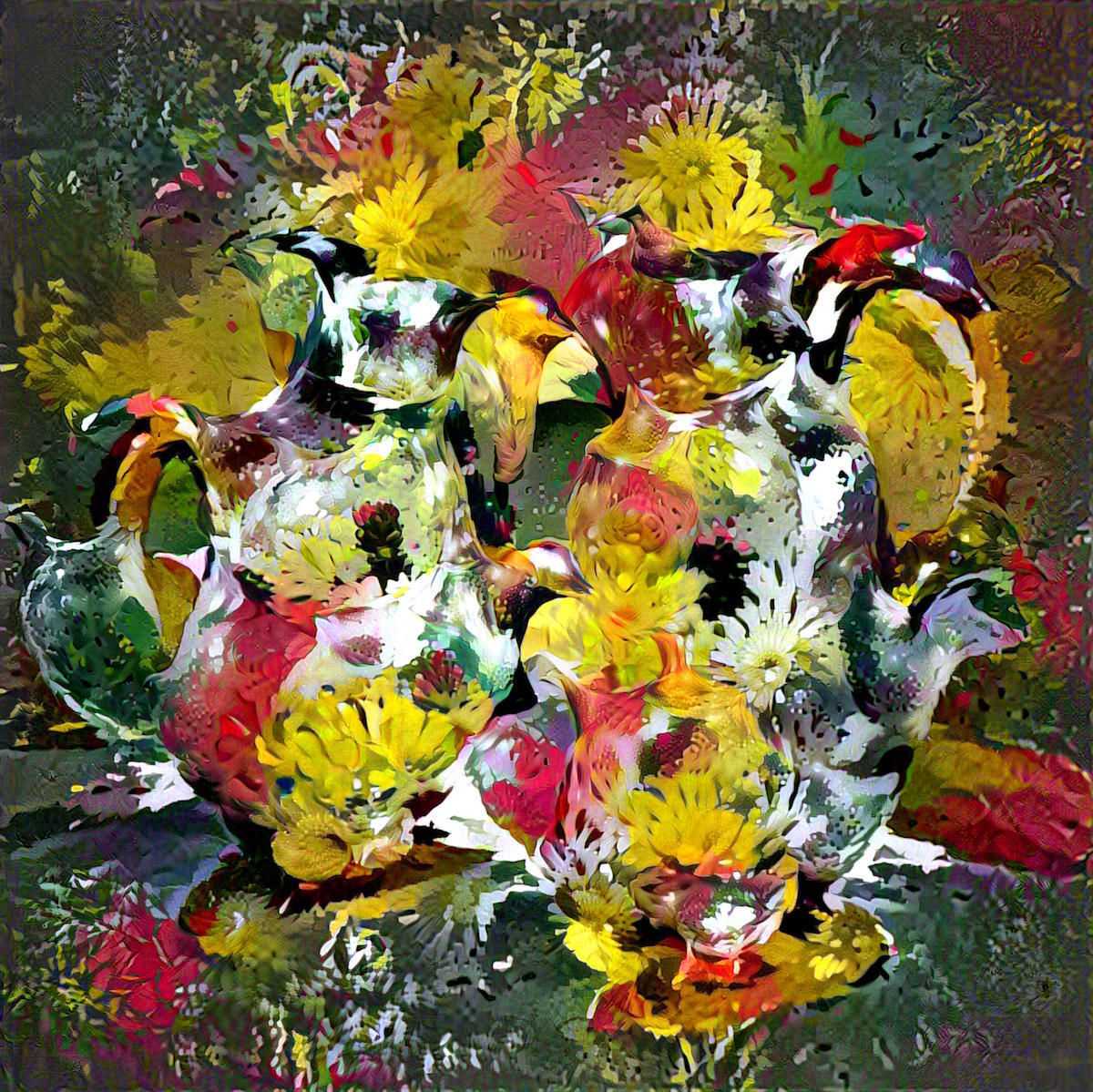 This piece is the result of two concepts an artificial neural network has learned about expressed simultaneously: Pitchers and Flowers. Together the form a blended new whole, though the combination has occured not in the space of pixels but in the semantic or latent space that is created beed inside the neural network.
