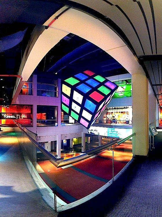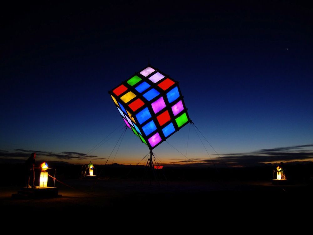 Groovik’s Cube is a fully playable, 35ft-high sculpture inspired by the classic puzzle, Rubik’s Cube. It was built by Mike Tyka, Barry Brumitt and a team of artists and engineers from Seattle in 2009. It is, to our knowledge, the largest functional Rubik’s Cube structure in the world. Groovik’s Cube is controlled from 3 control stations that surround the main structure - each player is able to rotate only one axis, creating an entirely new, collaborative puzzle solving experience. Groovik’s Cube offers a unique new playing mode where three players must collaborate to solve the classic Rubik’s cube puzzle. The cube is controlled via three touch screen interfaces located around the cube, with each interface capable of rotating only one axis of the cube - no single player can solve the cube alone. This innovative twist adds a completely new dimension to the game and turns the classic puzzle into a social game and a fascinating social spectacle. Groovik’s Cube is built from a lightweight aluminum frame, covered in fabric, and illuminated from the inside by 2 kilowatts of high-power LEDs. It simulates the motion of an ordinary Rubik’s Cube by animating the rotations on the 54 "pixels" that comprise the cube. The total weight of the structure is around 2000 lbs and is designed such that participants may walk safely under the structure. The thin supports are virtually invisible from a distance, creating the magical illusion of a floating cube.