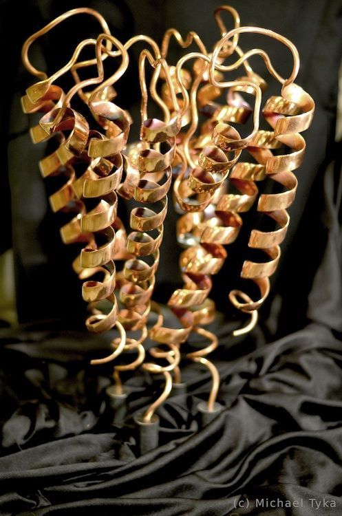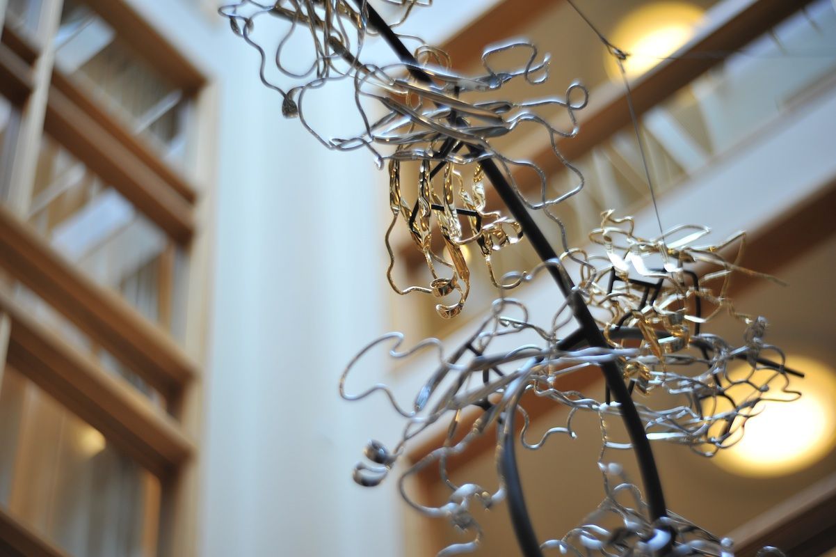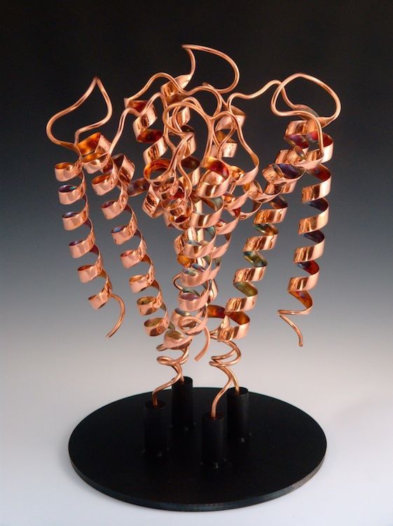 Life is a dynamic equilibrium of creation and destruction. Inside our cells the protein nano-machines, to which we owe our distinction from the inorganic, are perpetually recycled and rebuilt, forever battling the inevitable fate of entropic decay. Once covalently tagged with Ubiquitin, a protein is doomed to destruction by the proteasome, a protein degradation machine found in all of our cells. The component amino acids are then reused to synthesize new proteins. The constant recycling and rebuilding of proteins not only ensures that damaged proteins are removed quickly, but also allows rapid regulation of enzyme levels in the cell. The meandering path of the metal ribbon closely follows the fold and thus the internal structure of Ubiquitin. It features all of the major structural elements of typical proteins, including two alpha helices and a curved beta sheet. Its small size (76 amino acids) makes it one of the most studied proteins for protein folding and dynamics.