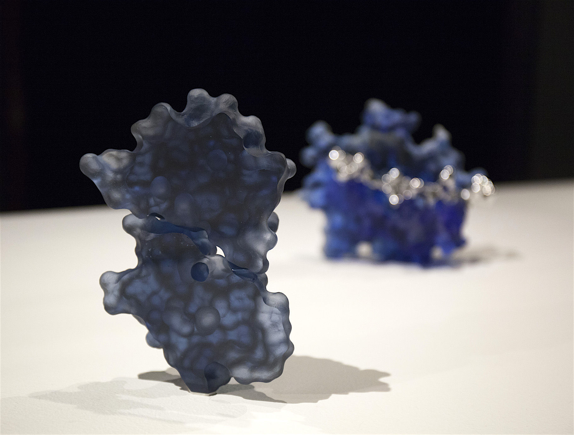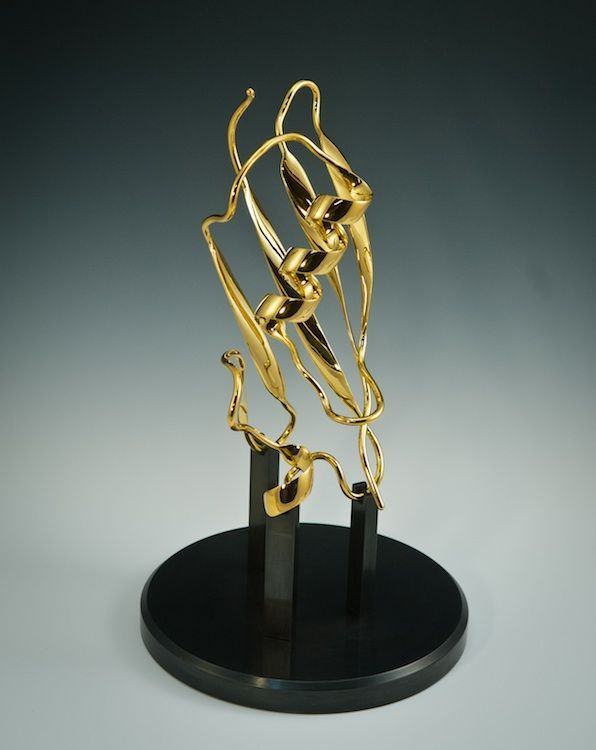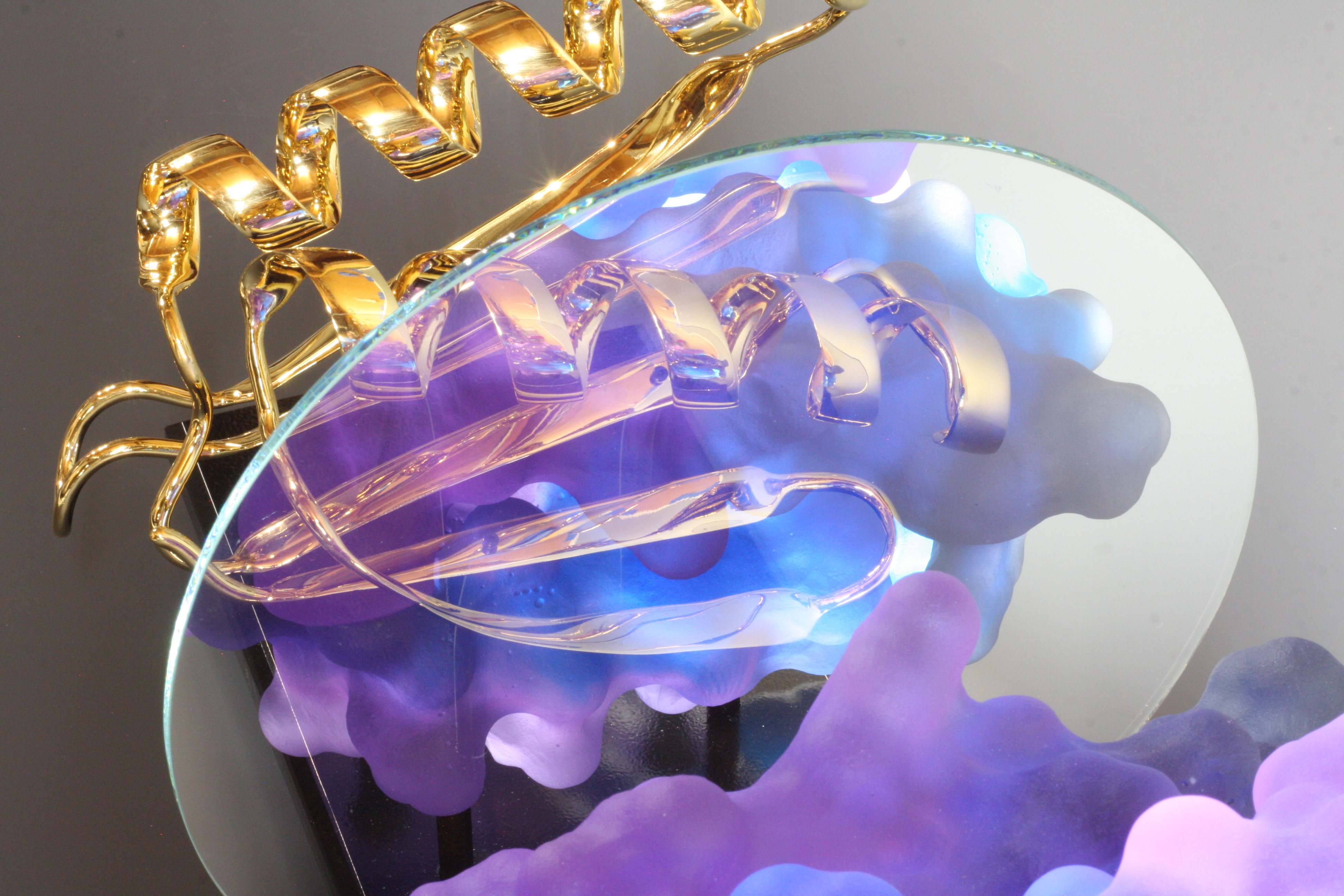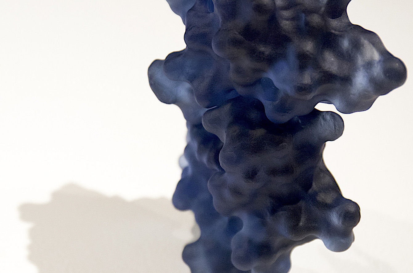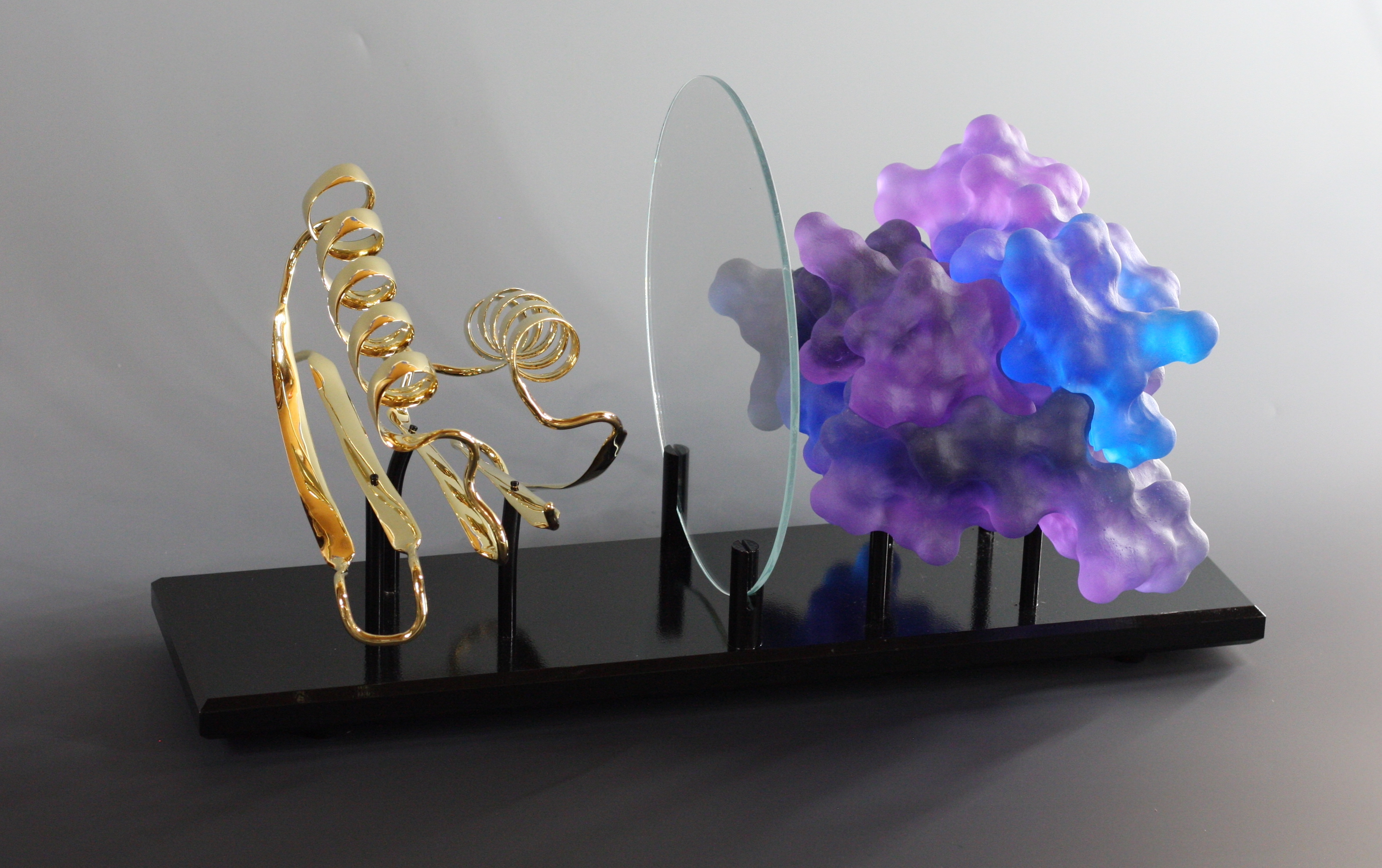 Top7 was the first denovo-designed protein with a fold not seen in nature. This piece was created as a commission for the Institute for Protein Design (IPD) on their 10th anniversary as a special gift to David Baker (my former PostDoc advisor). This sculpture comprises two representation of the protein Top7: one as a solvent accessible surface and one as a ribbon diagram. The half mirror allows the viewer to appreciate both representations superimposed one one another.