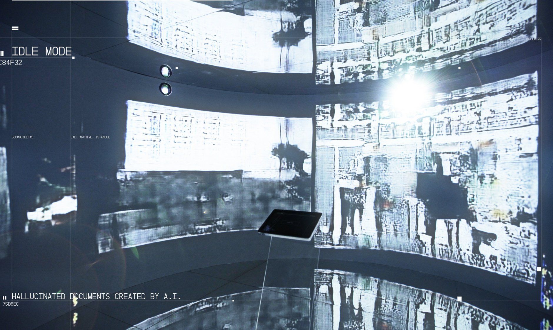 In this project, a temporary immersive architectural space is created as a canvas with light and data applied as materials. This radical effort to deconstruct the framework of an illusory space will transgress the normal boundaries of the viewing experience of a library and the conventional flat cinema projection screen, into a three dimensional kinetic and architectonic space of an archive visualized with machine learning algorithms. By training a neural network with images of 1,700,000 documents at SALT Research the main idea is to create an immersive installation with architectural intelligence to reframe memory, history and culture in museum perception for 21st century through the lens of machine intelligence.