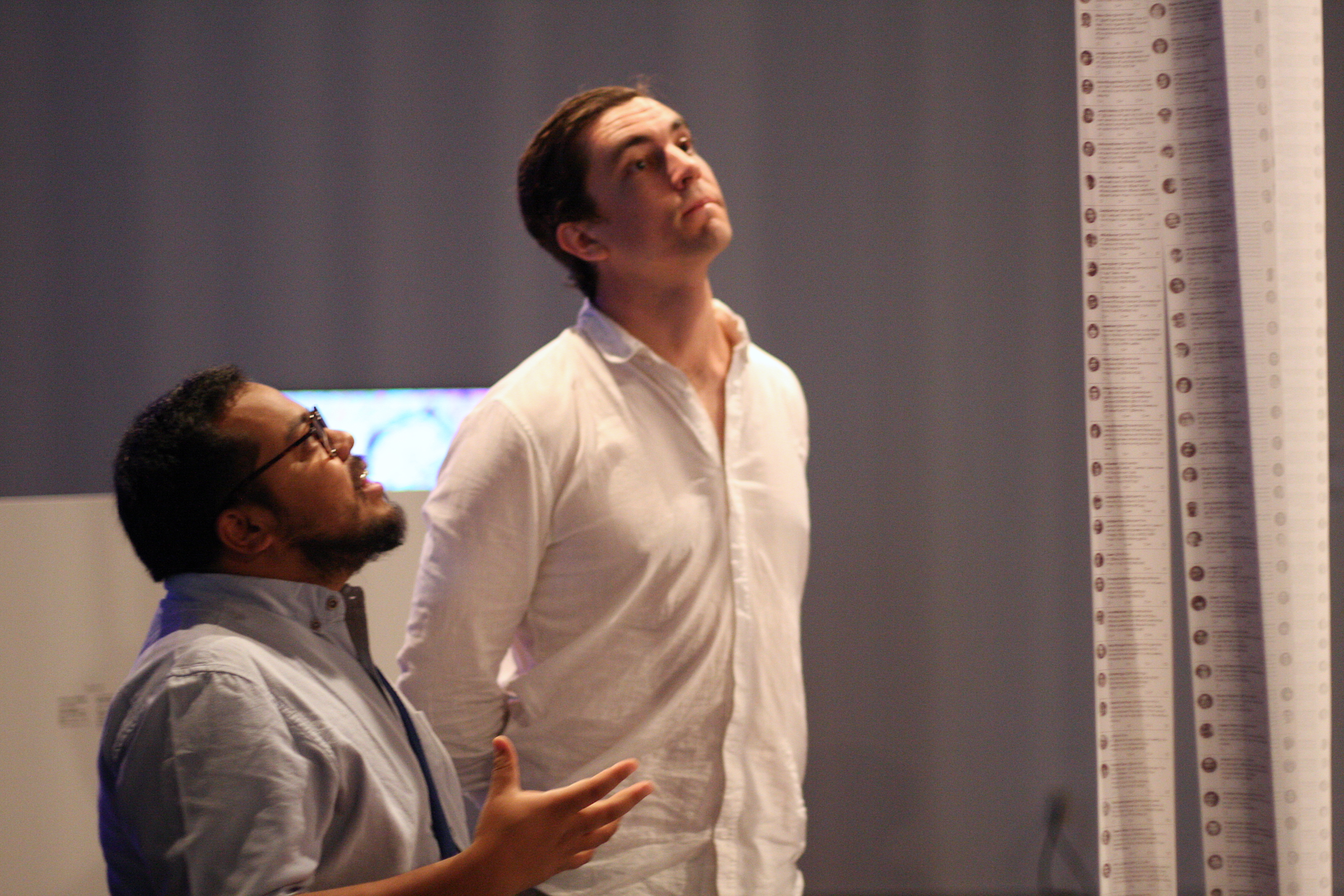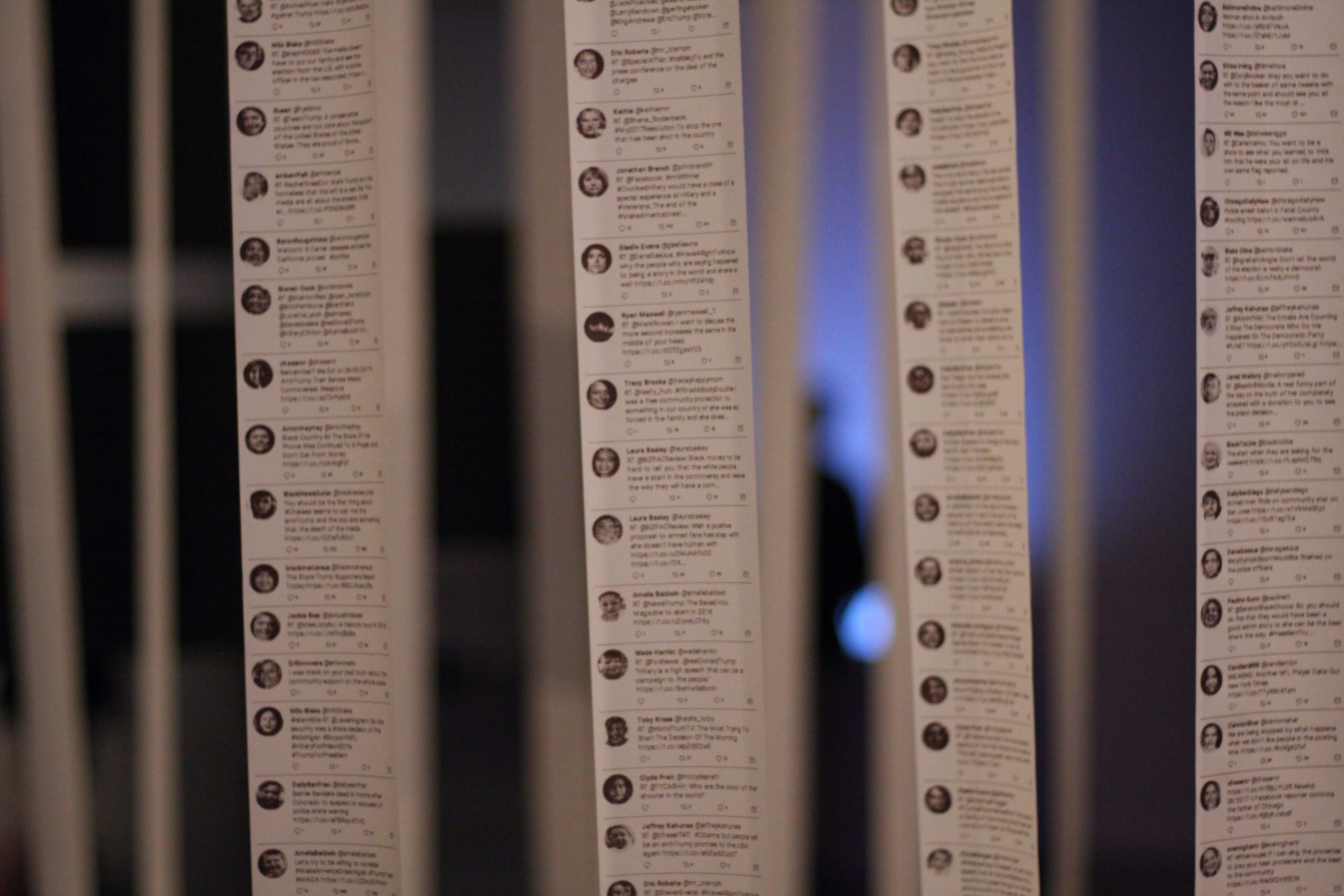 "Us and Them" is a multi-modal installation that combines the earlier "Portraits of Imaginary People" work with neural-net text generation and kinetic sculpture. Trained on a recently released set of two hundred thousand tweets from accounts identified as bots after the 2016 US presidential election and consequently evicted from Twitter, this piece features 20 machine-learning-driven printers which endlessly spew AI-generated political tweets by imaginary, generated people. The descending curtain of printer paper creates a central space with two chairs, inviting two people to sit, converse and connect, despite the torrent of machine-generated political propaganda that surrounds them.