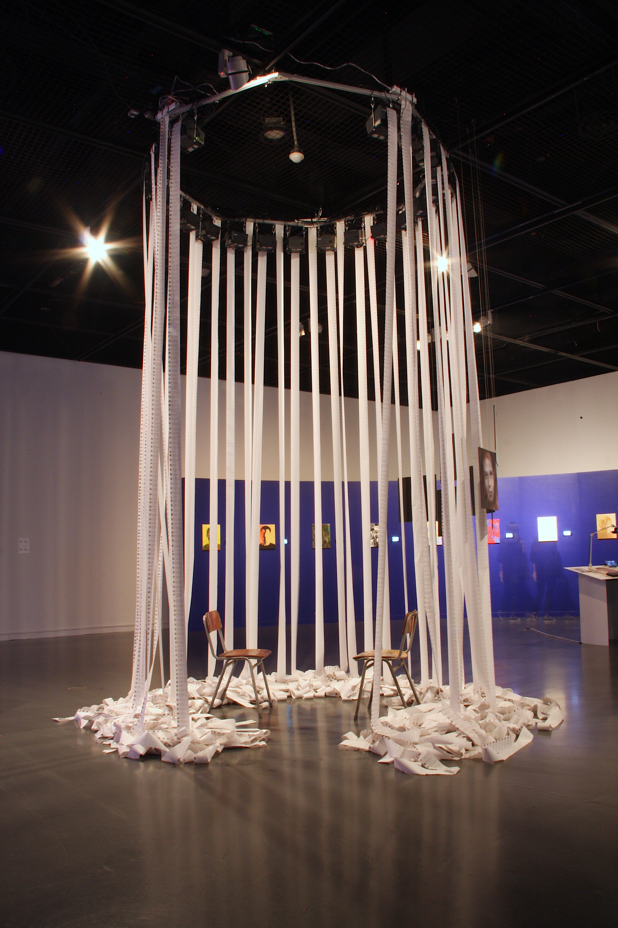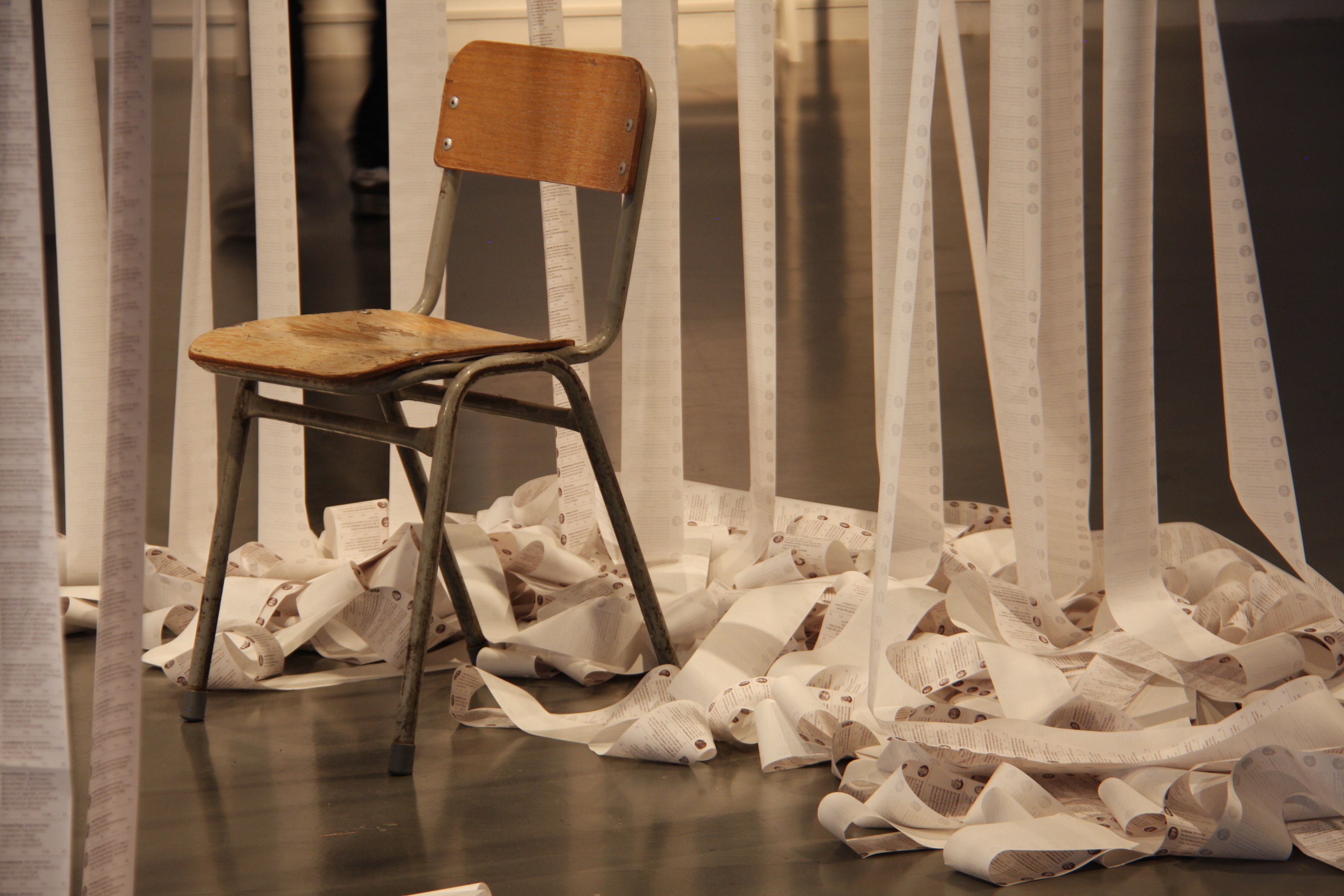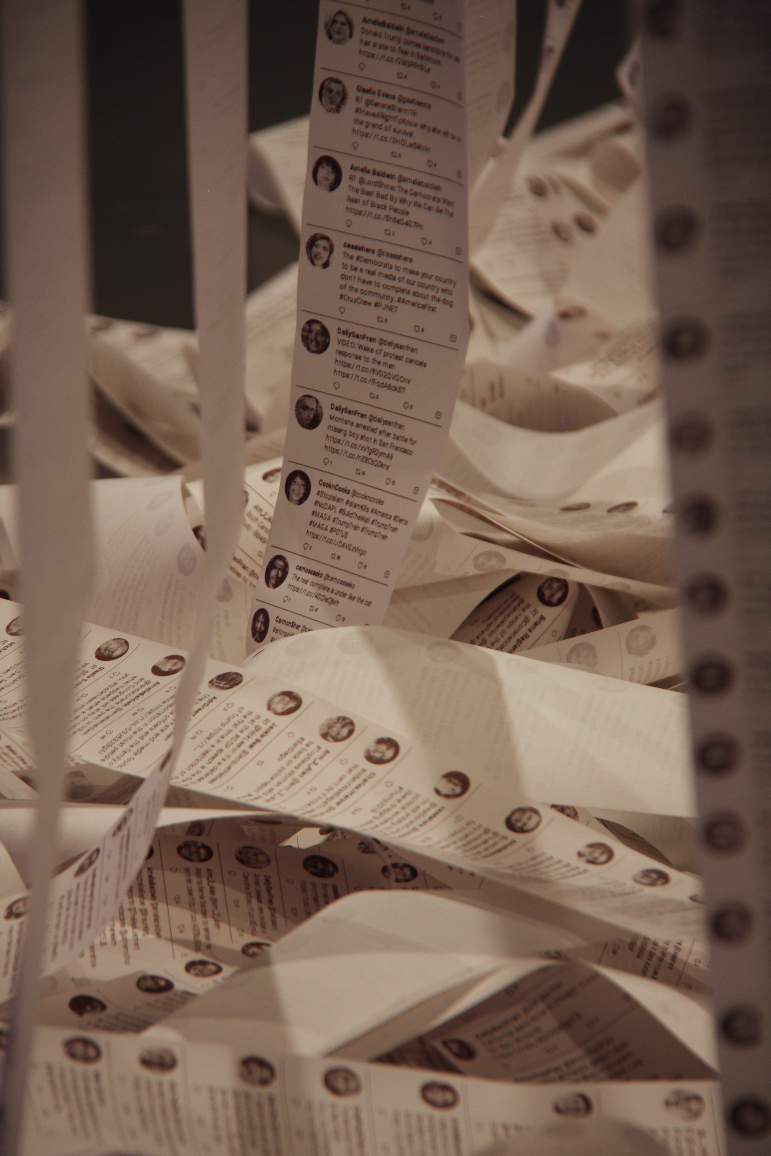 The 20 thermal receipt printers are live and continuously printing AI generated tweets at a slow but steady pace, letting this sculpture evolve and change every day. Ultimately the torrent overwhelm and bury the central space and chairs.